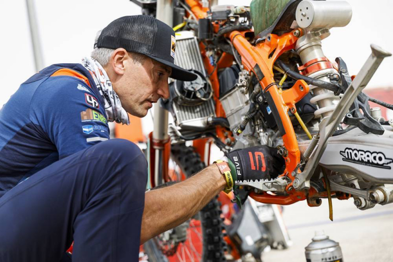 Ο Benjamin Melot προετοιμάζει τη μοτοσυκλέτα του για την 7η Ειδική Διαδρομή