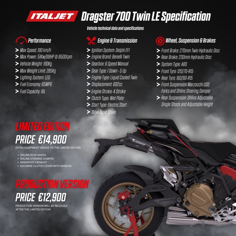 Η τιμή των δύο εκδόσεων έχει ανακοινωθεί με το Factory Limited Edition στα 14,900 € και την απλή έκδοση στα 12,900 €. Μετά το Dragster 559 Twin, το Italjet Dragster 700 Twin είναι ένα σκούτερ με οδήγηση μοτοσυκλέτας και το σίγουρο είναι ότι οι άνθρωποι της Italjet κατασκεύασαν αυτό το σκούτερ που δεν θέλουν να λέγεται έτσι, με την καρδιά τους.