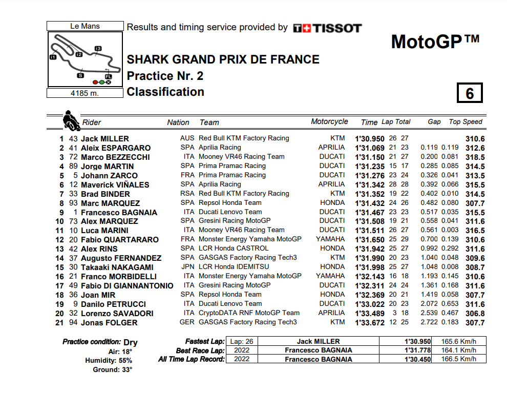 Με δύο λεπτά για το πέσιμο της καρό σημαίας, ο Aleix Espargaro φάνηκε ότι θα ήταν ο ταχύτερος της Παρασκευής με 1:31.069 – αλλά θα έπρεπε να αρκεστεί στη δεύτερη θέση μετά την τελική προσπάθεια του Miller στο 1:30.950.