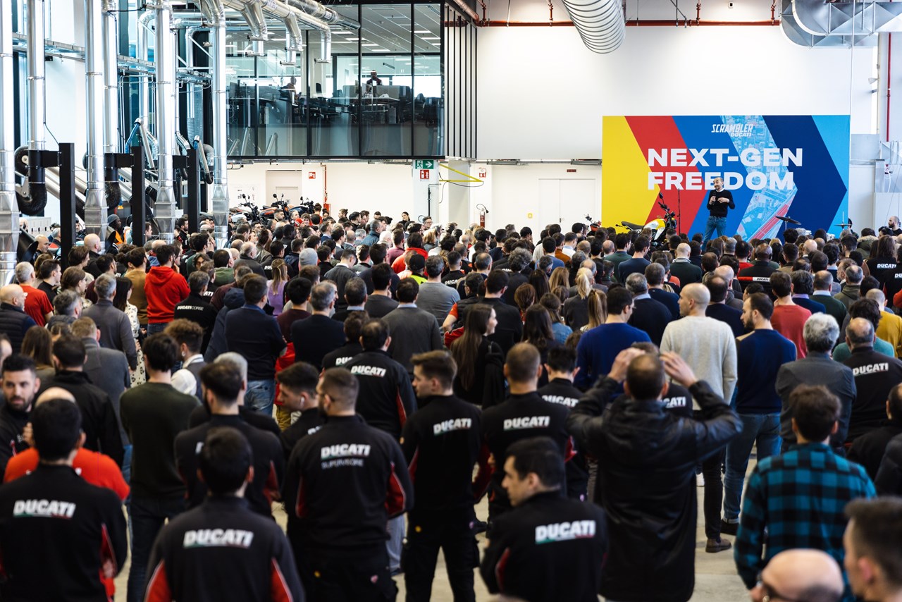 Η παραγωγή της πρώτης μονάδας γιορτάστηκε στο νέο κτίριο Finitura e Delibera Estetica. Μετά την παραδοσιακή «βάφτιση» από τον CEO Claudio Domenicali, η τελετή μετατράπηκε σε ένα πάρτι με animations και μουσική στο οποίο όλοι οι εργαζόμενοι μπορούσαν να θαυμάσουν και τα εννέα χρώματα της νέας Ducati Scrambler.