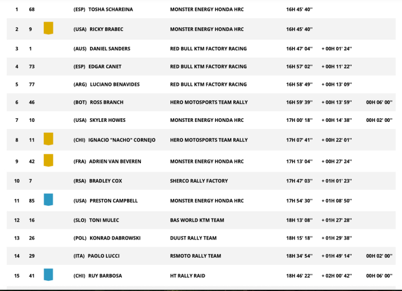 Ο Schareina πήρε μαζί και την πρωτοπορία στη γενική κατάταξη, αν και ο Αμερικανός Ricky Brabec βρίσκεται στην ίδια σχεδόν μοναδική μονάδα του δευτερολέπτου. Οι δύο επικεφαλής της Monster Energy Honda HRC είναι ισόβαθμοι μετά από πέντε ημέρες αγώνα, με τον Ισπανό να προηγείται χάρη στην καλύτερη επίδοσή του στη σημερινή Ειδική.