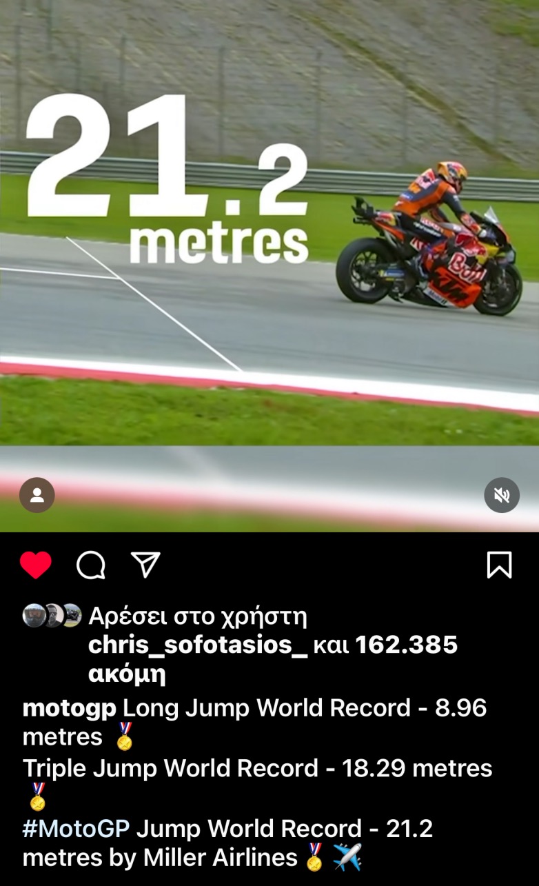 O Jack Miller λοιπόν ανακηρύχθηκε άτυπα Παγκόσμιος Πρωταθλητής μήκους με μοτοσυκλέτα MotoGP, δηλαδή είναι ο Μίλτος Τεντόγλου του MotoGP! Να θυμίσουμε ότι ο Έλληνας Παγκόσμιος Πρωταθλητής και Ολυμπιονίκης στο μήκος, είναι και ο ίδιος μοτοσυκλετιστής και έχει κάνει πολλά ταξίδια στο παρελθόν με μοτοσυκλέτα και μάλιστα μεγάλα ταξίδια εκτός Ελλάδας, στην Ευρώπη.