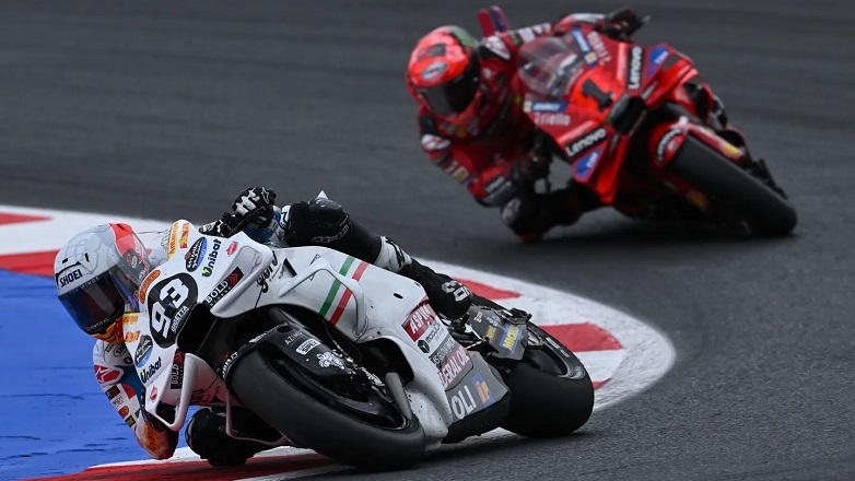Μπροστά, ο Bagnaia προσπάθησε να κρατηθεί κοντά στον Marc Marquez, όμως στα τελευταία στάδια ο Ισπανός 8 φορές Παγκόσμιος Πρωταθλητής άρχισε να ανοίγει τη διαφορά, έκανε νέο ρεκόρ γύρου κατά τη διάρκεια αγώνα (1:31.564) και έφτασε στη δεύτερη συνεχόμενη νίκη του, μετά την Αραγονία.