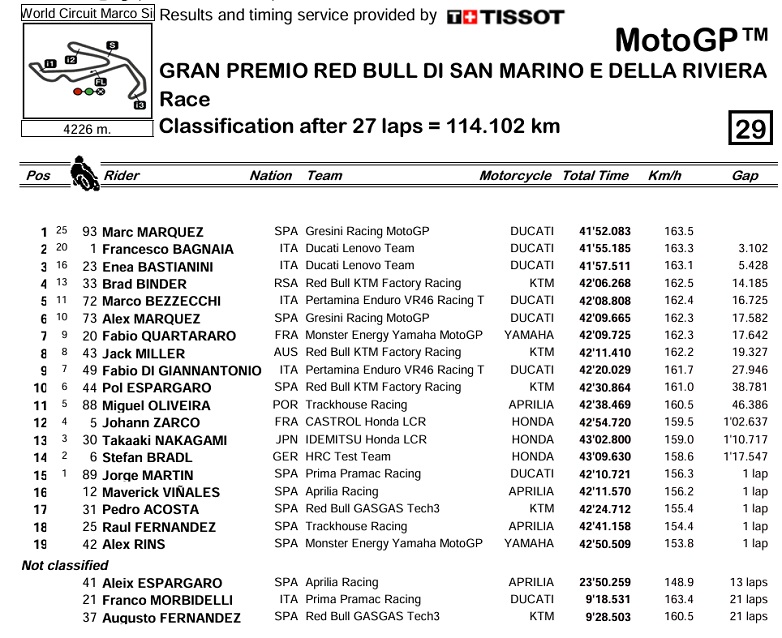 Ο Brad Binder τερμάτισε τέταρτος, μπροστά από τον Marco Bezzecchi και τον Alex Marquez. Έβδομος ήταν ο Jack Miller, με τους Fabio Quartararo, Fabio Di Giannantonio και Pol Espargaro να συμπληρώνουν την πρώτη δεκάδα.
