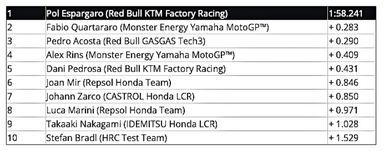 Ο αναβάτης δοκιμών της Red Bull KTM Factory Racing, Pol Espargaro, ολοκλήρωσε την 2η μέρα του Sepang Shakedown Test πρώτος στα φύλλα χρόνου, αφού το #44 σημείωσε 1:58.241, χρόνο γύρου λίγο λιγότερο από τρία δέκατα μακριά από τον Fabio Quartararo (Monster Energy Yamaha MotoGP™) και τον νεοεμφανιζόμενο σταρ Pedro Acosta (Red Bull GASGAS Tech3).
