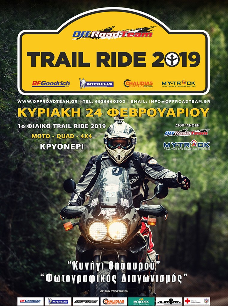 H διαδρομή διατίθεται σε Road Book ή σε «ίχνος» για GPS συσκευές και smartphone, ενώ θα υπάρχουν και συνεχείς παρακάμψεις για όσους θέλουν να κάνουν ακόμα λιγότερα χιλιόμετρα. Το Trail Ride στηρίζουν οι εταιρείες Motorex, BF Goodrich, My-Track, Chalidias Electrics, Michelin, Aurora Rally Equipment, Bafetis Workshop, καθώς και οι χορηγοί επικοινωνίας που πιστεύουν και προωθούν τις όμορφες εκδηλώσεις του Off Road Team. Περισσότερες πληροφορίες στo: www.offroadteam.gr