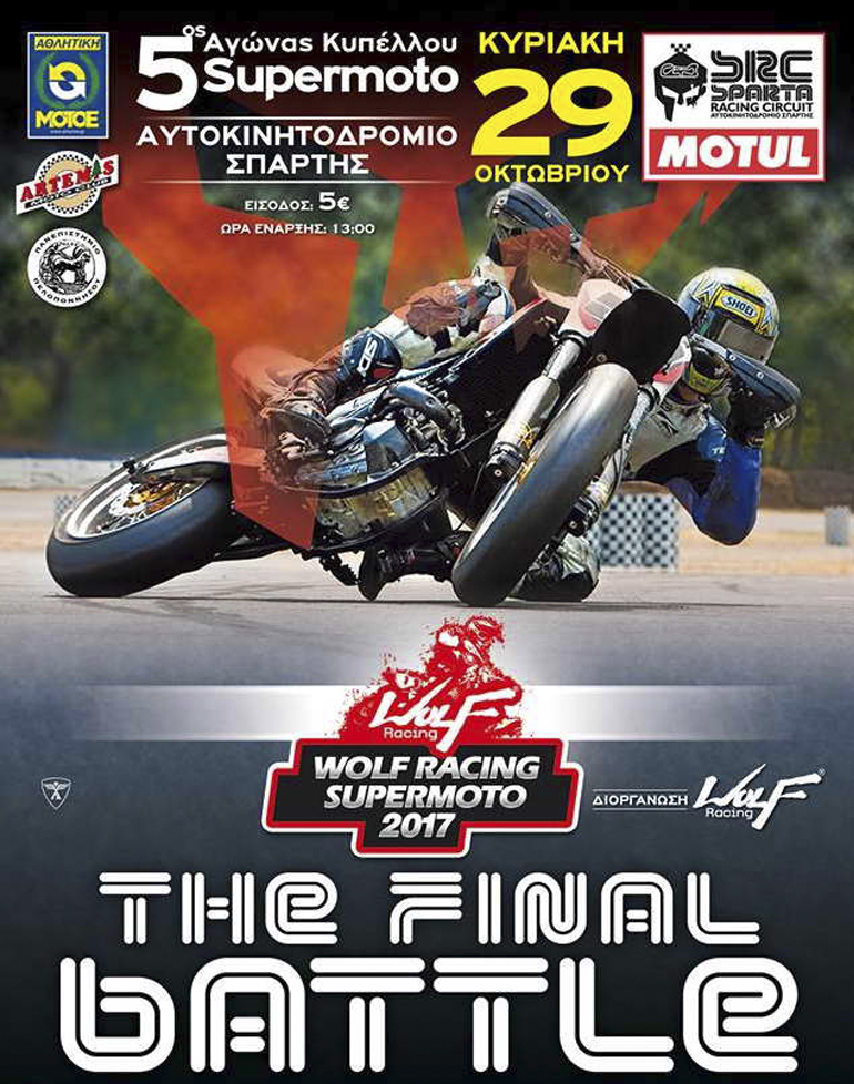 Οι αγώνες Supermoto γνώρισαν τεράστια άνθηση στη χώρα μας τα τελευταία 20 χρόνια και αυτό δεν είναι τυχαίο. Το θέαμα που προσφέρουν είναι συναρπαστικό και οι μάχες που γίνονται κυριολεκτικά κόβουν την ανάσα. Ο θεσμός του Wolf Supermoto Cup είναι αυτός που αναβιώνει το άθλημα της… πλαγιολίσθησης και σας καλεί να δείτε από κοντά τις προσπάθειες των αναβατών στο αυτοκινητοδρόμιο της Σπάρτης την Κυριακή 29 Οκτωβρίου.