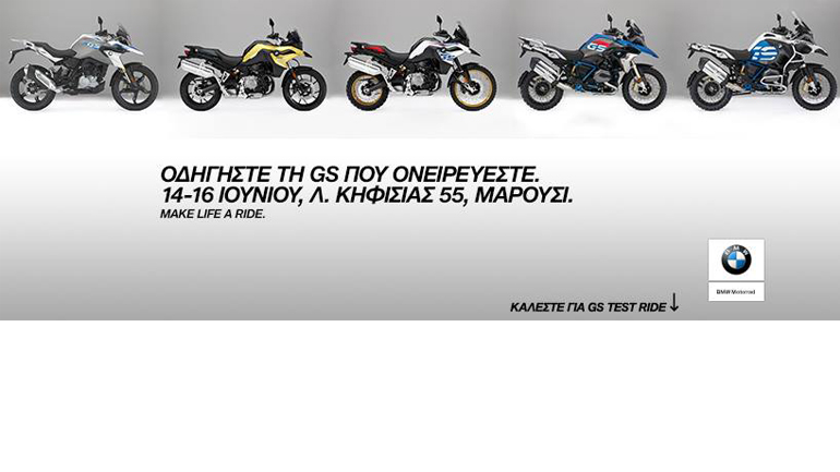 Και ναι, έφτασε η στιγμή να οδηγήσετε το μοντέλο GS που πάντα ονειρευόσασταν, αρκεί να βρίσκεστε στην Αθήνα και να επισκεφθείτε τις εγκαταστάσεις της BMW Motorrad Σφακιανάκης στο Μαρούσι 14-16 Ιουνίου, Λ. Κηφισίας 55. Εκεί θα σας περιμένουν για test ride όλα τα μοντέλα R/GS, από το μικρότερο 310 έως τα θηριώδη 1200, όπως επίσης και τα νέα F 750/850GS! Πριν πάτε, καλό είναι να κλείσετε το ραντεβού σας άμεσα στο τηλ. 210-6100810. Και όταν πάτε, θυμηθείτε να έχετε μαζί σας το σωστό εξοπλισμό και το κατάλληλο δίπλωμα οδήγησης. Καλές βόλτες σας ευχόμαστε!