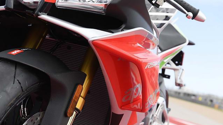 Το βάψιμο είναι το πρώτο στοιχείο που παρατηρεί κάποιος, καθώς μας πηγαίνει πίσω στο 1987, όπου με έναν αντίστοιχο τρικολόρε χρωματικό συνδυασμό ο Loris Reggiani έδωσε τότε στην εταιρεία από το Noale την πρώτη της νίκη στο παγκόσμιο πρωτάθλημα ταχύτητας. Με μια δεύτερη, πιο προσεκτική ματιά, βλέπουμε και το δεύτερο -και πλέον «αγωνιστικό»- στοιχείο, το οποίο δεν είναι άλλο από τα winglets (λέγε με «φτεράκια») που έρχονται εξελιγμένα απευθείας από το MotoGP.