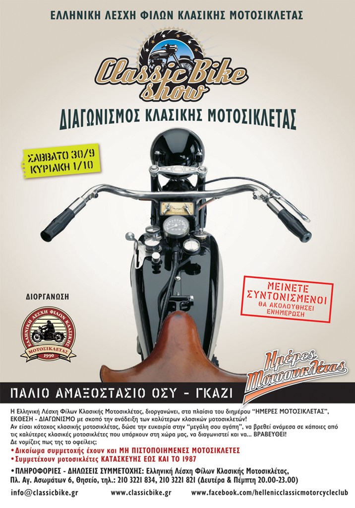 Η Ελληνική Λέσχη Φίλων Κλασικής Μοτοσυκλέτας, στα πλαίσια της διήμερης εκδήλωσης Ημέρες Μοτοσυκλέτας (30/9 & 1/10 στο αμαξοστάσιο του ΟΣΥ στο Γκάζι), διοργανώνει έκθεση – διαγωνισμό με σκοπό την ανάδειξη των καλύτερων κλασικών δίτροχων μοντέλων.