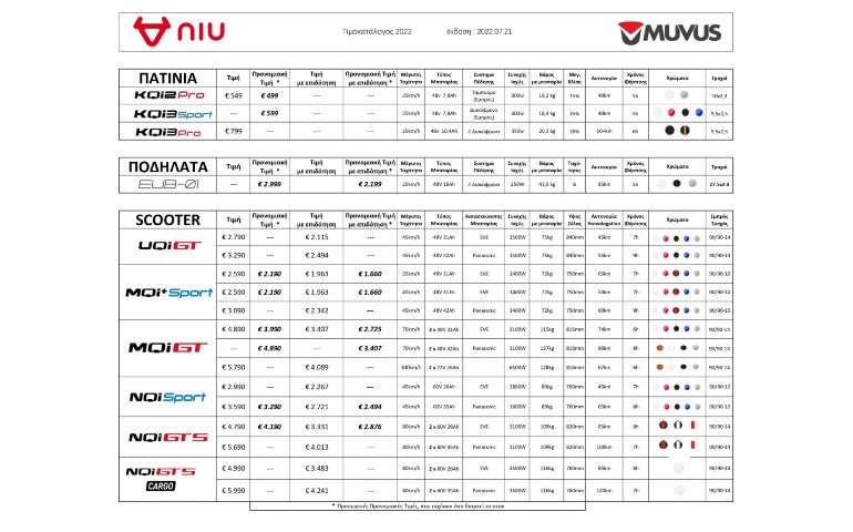 Τα μοντέλα τα οποία μπορεί να βρει κανείς σε προνομιακές τιμές είναι το MQi+ Sport, το MQi GT, το NQi Sport και το NQi GTS. Τα συγκεκριμένα δίκυκλα είναι σε περιορισμένο αριθμό. Σε προνομιακή τιμή επίσης μπορείτε να βρείτε το ηλεκτρικό ποδήλατο EUB-01, ενώ στην γκάμα της NIU θα βρείτε και ηλεκτρικά πατίνια.