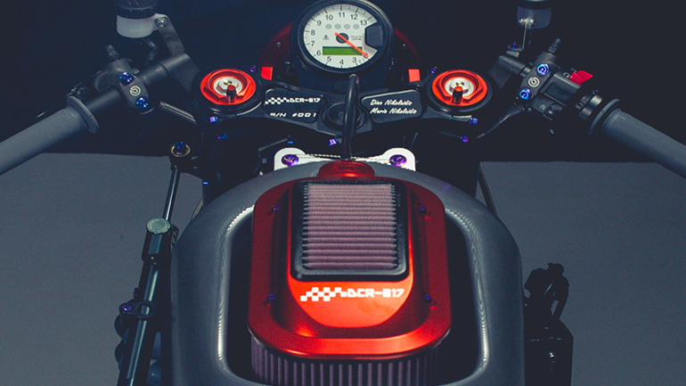Η αλήθεια είναι πικρή για εμάς που δε θα την οδηγήσουμε. Ουσιαστικά πρόκειται για ένα «δαιμονισμένο» KTM RC8R με αρκετές τροποποιήσεις και το αγωνιστικό κιτ της KTM, που υπό τις φροντίδες της DNA, απαρνήθηκε το ..dna του και μεταλλάχθηκε από ένα ντυμένο όπλο πίστας σε μια γυμνή απειλή του δρόμου. Και πως αλλιώς θα μπορούσε να χαρακτηριστεί άλλωστε μια μοτοσυκλέτα με 186 ίππους και βάρος τόσο χαμηλό που η αναλογία ίππων ανα κιλό δείχνει πως ένα «ελληνοποιημένο» αυστριακό «άλογο» αντιστοιχεί σε λιγότερο από ένα κιλό! Ποιος δε θα ξέχναγε και το όνομά του μετά από μια τέτοια βόλτα; Σχεδιαστικά μιλώντας, στο φίλτρο αέρα που ευτυχώς μόνο διακριτικό δεν είναι, οι παρατηρητικοί θα δουν πως υπάρχει και ένα café racer γύρω του. Ώρες αμέτρητες έκαναν τα σχέδια στο χαρτί να βρούν ψηφιακούς δρόμους και από εκεί με τη σειρά τους να γίνουν απτές αποδείξεις της ελληνικής προσπάθειας. Αλουμίνιο το επικρατέστερο υλικό, με το ρεζερβουάρ να γεννιέται από ένα συμπαγές κομμάτι 140+ κιλών για να καταλήξει στα 3,6 μετά από 400 ώρες «σκαλίσματος» ή καλύτερα ρομποτικής γλυπτικής α λα CNC. Βέβαια η DCR 017 δεν είναι μόνο ένας συνδυασμός ακριβής «αγριάδας» και ομορφιάς. Πάνω από όλα είναι απόδειξη της ύπαρξης της αντίστοιχης μηχανολογικής γνώσης στη χώρα μας αλλά και του μαγικού συστατικού που λέγεται «μεράκι». Συστατικό που αναγνώρισε και η Akrapovic, δένοντας το γλυκό με ένα τελικό που ανταριάζει τα αυτιά σε ρυθμούς MotoGp.
