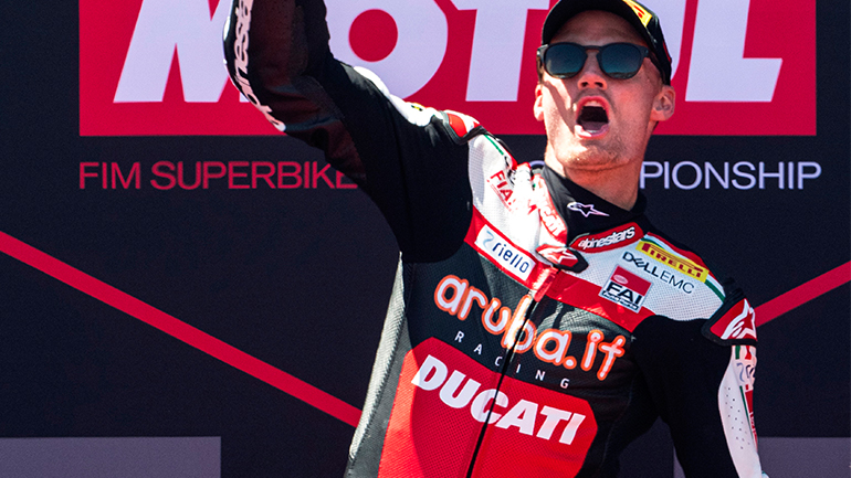 Στην ίδια δημοπρασία έχει δωρίσει και ο Chaz Davies τη δερμάτινη φόρμα που φορούσε στο φετινό νικητήριο αγώνα των WSBK στη Laguna Seca. Αξίζει να σημειωθεί πως και η φόρμα είναι στα επετειακά χρώματα του Anniversario 916.