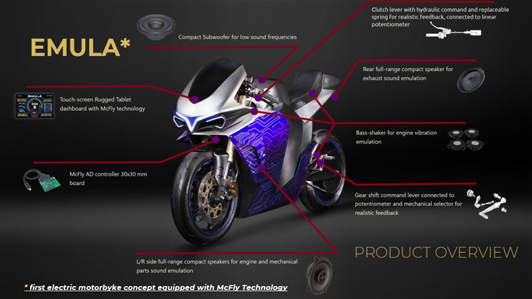 Από το όνομα κιόλας (το Emula βγαίνει από το emulate, δηλαδή προσομοιώνω) φαίνεται πως τα δίτροχα φαινόμενα θα απατούν. Έτσι, αν και πρόκειται για ηλεκτρικό superbike, ο ήχος του είναι εντελώς… άλλος, καθώς στο γύρισμα του γκαζιού μπορεί να ακουστεί τετράχρονος ή δίχρονος κινητήρας, συνοδευόμενος από το δέον κιβώτιο ταχυτήτων.