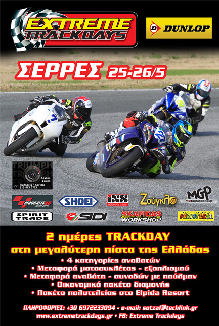 Η Extreme Track days ανακοινώνει την πρώτη της φετινή εκδήλωση στο Αυτοκινητοδρόμιο Σερρών. Πιο συγκεκριμένα, το Σάββατο 25 και την Κυριακή 26 Μαΐου, η γνωστή εταιρεία θα διοργανώσει στη μεγαλύτερη πίστα της Ελλάδας ολοήμερες οργανωμένες δοκιμές για αναβάτες κάθε επιπέδου. Πιο συγκεκριμένα, η εκδήλωση θα περιλαμβάνει τέσσερις ομάδες αναβατών: Αρχάριοι, Ενδιάμεσοι, Προχωρημένοι και Αγωνιζόμενοι/Εxpert αντίστοιχα. Πριν την έναρξη θα διεξαχθεί σεμινάριο επεξήγησης κανόνων ασφαλείας στην πίστα, η παρακολούθηση του οποίου θεωρείται υποχρεωτική για όλους τους συμμετέχοντες.