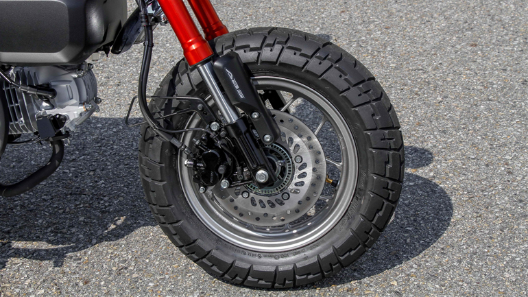 Το ABS ενεργοποιείται στο μπροστινό δισκόφρενο των 220mm με τη διπίστονη δαγκάνα και σε συνεργασία με τη μονάδα IMU προσφέρει λειτουργία που εμποδίζει την ανασήκωση του πίσω τροχού στα βίαια φρεναρίσματα. Και μην ψάχνετε για μαρσπιέ συνεπιβάτη, παραδοσιακά το Monkey είναι φτιαγμένο για τον οδηγό του.