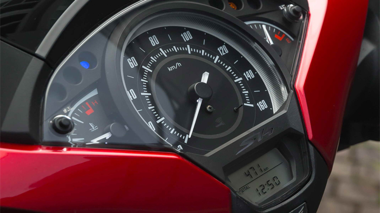 Το μπροστινό ντουλαπάκι είναι μεγαλύτερο από πριν και περιέχει έναν χρήσιμο φορτιστή 12V, ενώ δεν λείπει ο πρακτικός γάντζος για τις σακούλες με τα ψώνια. Ένσταση χρηστικής μορφής θα υποβάλω για την τάπα του ρεζερβουάρ των 7,5 λίτρων, που εξακολουθεί να βρίσκεται κάτω από τη σέλα και να απαιτεί κατέβα-άνοιξε-κλείσε-ανέβα κάθε φορά που επισκεπτόμαστε το βενζινάδικο. Τα όργανα είναι ευανάγνωστα, με αναλογικές ενδείξεις για τη στάθμη καυσίμου και τη θερμοκρασία κινητήρα και ένα μεγάλο, επίσης αναλογικό, ταχύμετρο στο κέντρο.