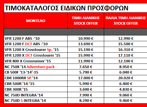Μία νέα τιμολογιακή πολιτική για συγκεκριμένα μοντέλα και για περιορισμένο αριθμό «τρέχει» εδώ και Για όσους αναζητούν καινούργια μηχανή υπάρχει και η λύση μοτοσικλετών στοκ σε καλές τιμές….λίγες ημέρες η εισαγωγική εταιρεία των μοτοσικλετών Honda.