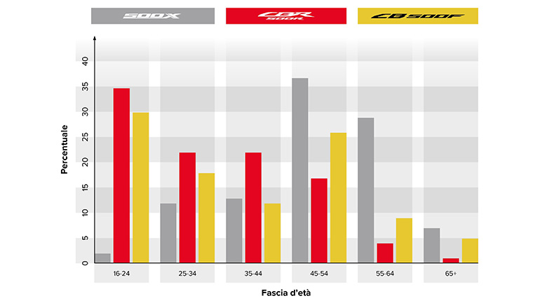 Η απόδοση του δικύλινδρου εν σειρά κινητήρα τους (35Kw) είναι και το μυστικό της επιτυχίας τους, δίνοντας τη δυνατότητα στους πολυπληθείς αναβάτες με διπλώματα Α2 να αποκτήσουν μοτοσικλέτες με έμφαση στη χρηστικότητα, την ευκολία οδήγησης, την αξιοπιστία και τη μεγάλη οικονομία σε συντήρηση και κατανάλωση. Σύμφωνα με δηλώσεις της Honda, το 46% των ιδιοκτητών CB500F και το 29% των κατόχων CBR500R είναι άτομα κάτω των 30 ετών, με το 30% και 35% αντίστοιχα να μην έχουν ξεπεράσει το 24ο έτος της ηλικίας τους. Αυτά τα ποσοστά καθρεφτίζουν την επιτυχία των μοντέλων να φέρουν στην αγορά νέους ανθρώπους, κόντρα στο ρεύμα της εποχής που θέλει το κοινό της μοτοσικλέτας να «γερνάει» όλο και περισσότερο. Στο γράφημα που παραθέτουμε μπορείτε να δείτε την ηλικιακή κατανομή των ιδιοκτητών ανά μοντέλο.