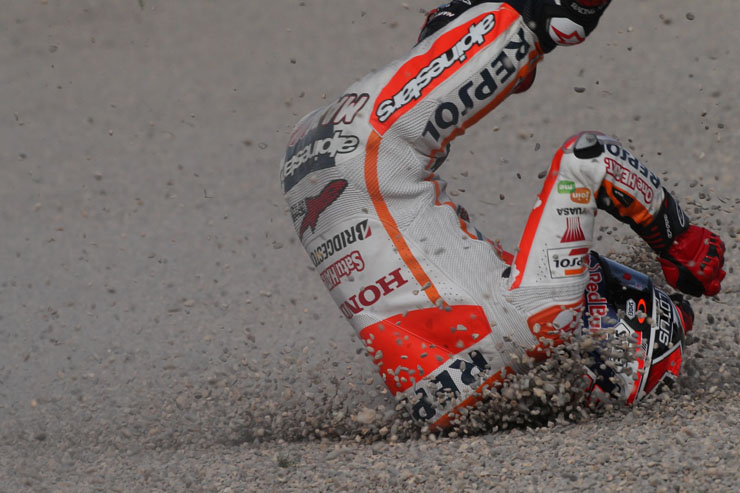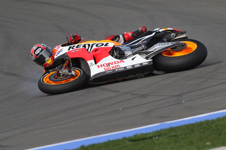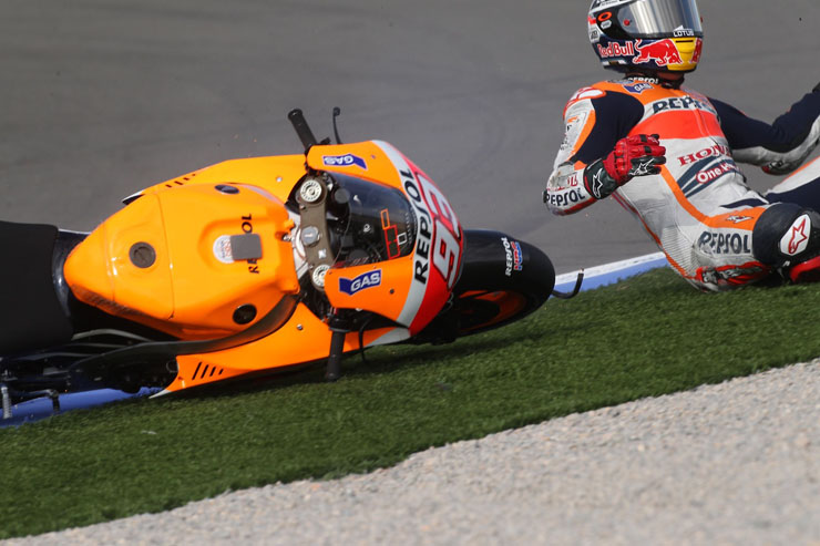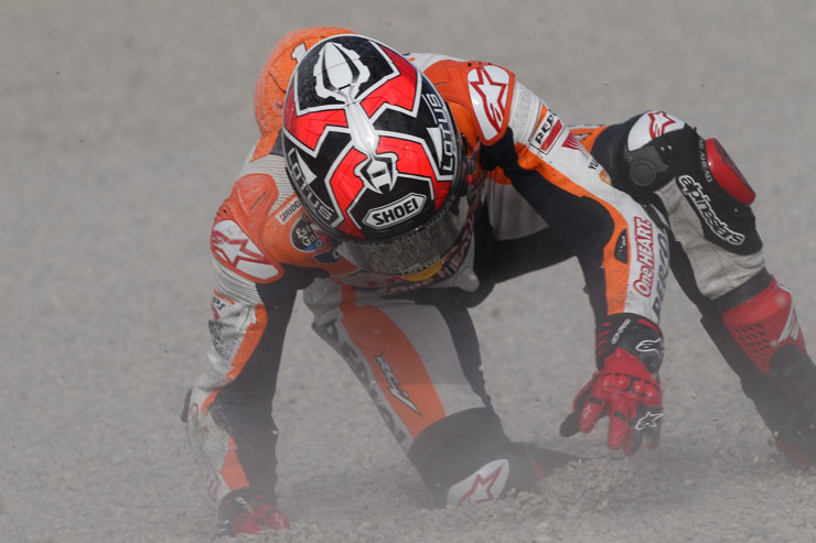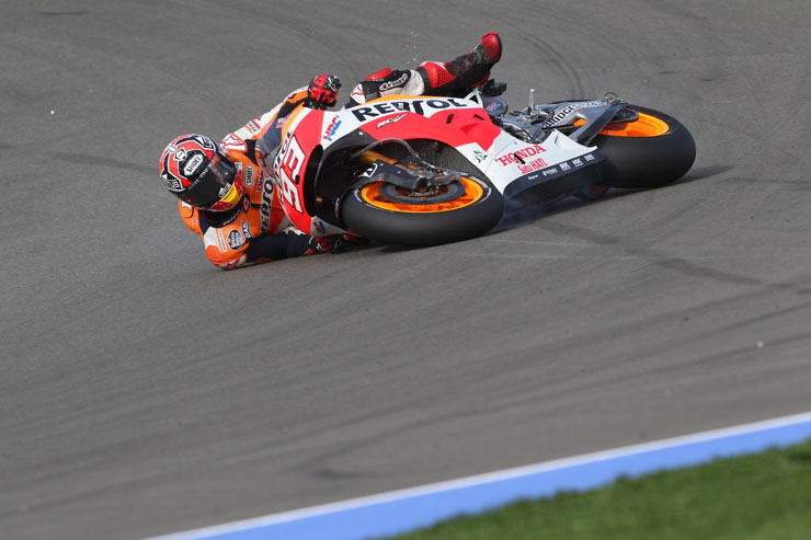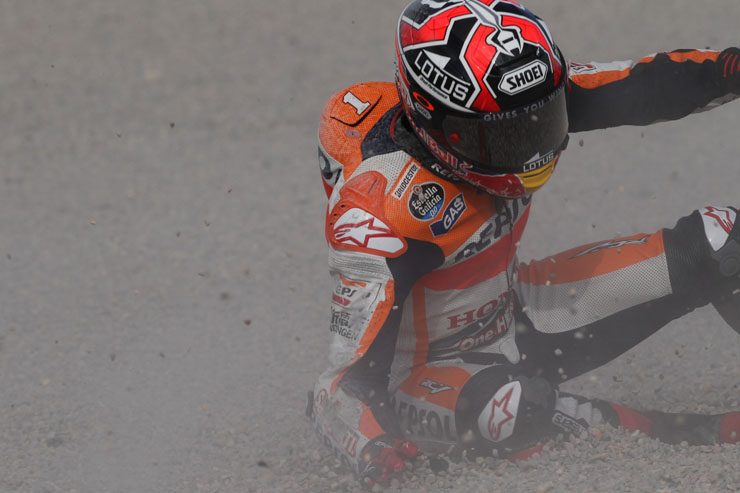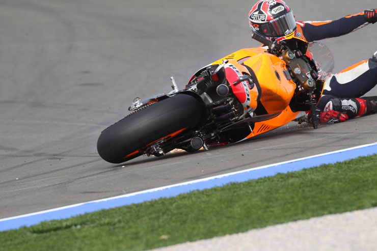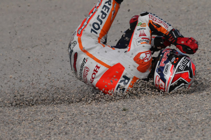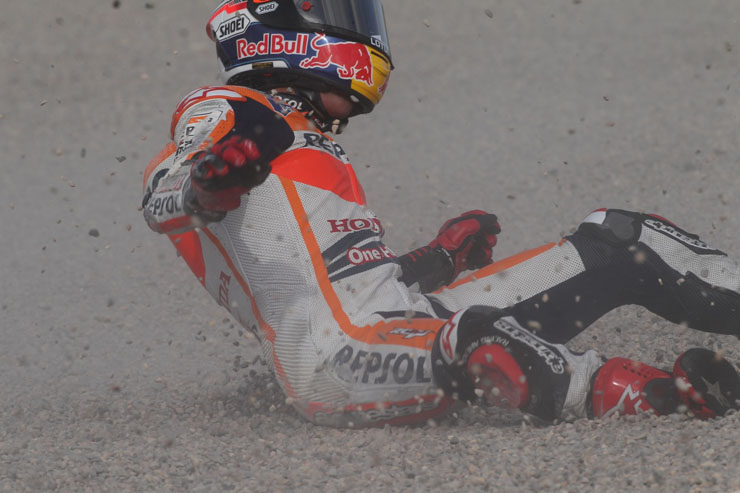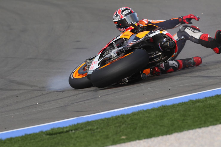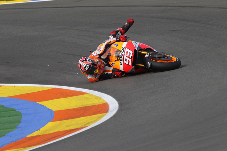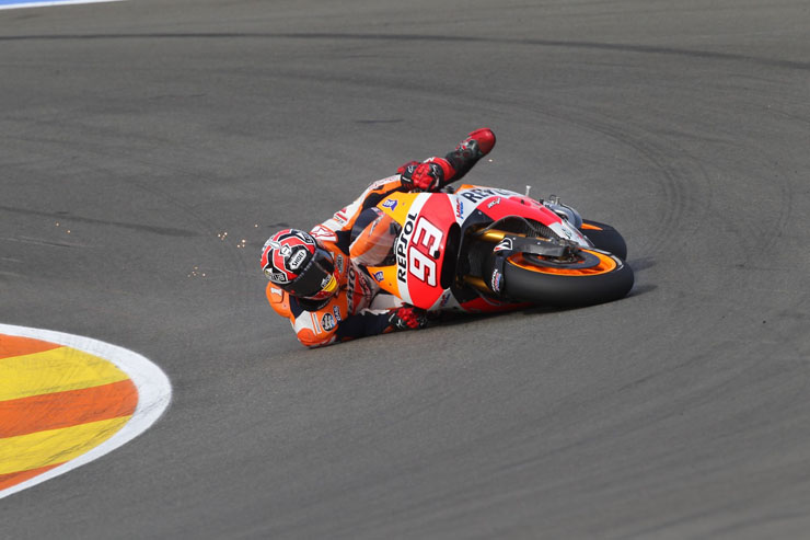 Οι πτώσεις είναι ένα σύνηθες φαινόμενο στο παγκόσμιο πρωτάθλημα ταχύτητας μοτοσικλετών MotoGP. Αυτή τη φορά πτώση είχε στις κατατακτήριες δοκιμές της Βαλένθια ο Μάρκεζ χωρίς ευτυχώς να τραυματιστεί.