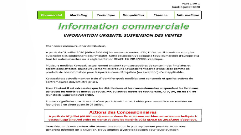 Ένα ακόμα πλήγμα μετά το lockdown για τους εμπορικούς συνεργάτες και πελάτες της πράσινης εταιρείας, αυτή τη φορά νομικής φύσεως, αν και οι πηγές λένε ότι αυτή η κατάσταση δεν θα διαρκέσει πολύ. Ένα εσωτερικό υπόμνημα της Kawasaki France προς τους συνεργάτες της, που -άγνωστο πως- διέρρευσε στον τύπο, αποκαλύπτει το πρόβλημα. Ως καθαρά προληπτικό μέτρο, η Kawasaki France φαίνεται να αναστέλλει τις πωλήσεις μοτοσικλετών και άλλων οχημάτων σε όλο το δίκτυο αντιπροσώπων της χώρας. Σύμφωνα με το γαλλικό περιοδικό μοτοσικλέτας Moto-Station, η εσωτερική ανακοίνωση της Kawasaki France ενημερώνει τους αντιπροσώπους ότι υπάρχει πιθανότητα μη συμμόρφωσης σε πρότυπο ασφάλειας των καταναλωτών σχετικά με τη χρήση φθαλικών ενώσεων (χημικές ενώσεις, εστέρες) στα πλαστικά, το οποίο τέθηκε σε ισχύ από τις 7 Ιουλίου 2020.