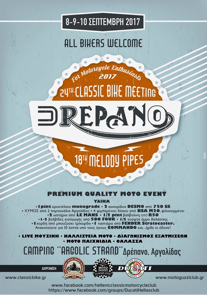 Η 24η Συγκέντρωση Κλασικής Μοτοσυκλέτας φιλοξενεί τις 18ες Μελωδικές Εξατμίσεις και παρέα μας περιμένουν όλη την ..παλιοπαρέα στο Δρέπανο το ερχόμενο τριήμερο 8-9-10 Σεπτεμβρίου. Και για να προετοιμαστείτε κατάλληλα, ιδού το πρόγραμμα εκδηλώσεων για όλες τις μέρες: