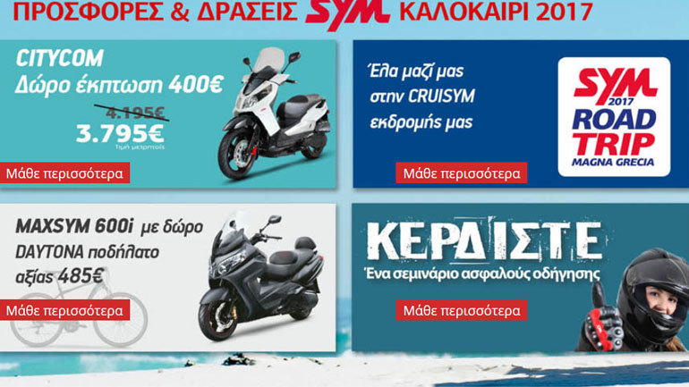 Η δεύτερη το σεμινάριο ασφαλούς οδήγησης για τα Megascooters SYM στην πίστα του Αγίου Κοσμά, η τρίτη την αγορά του MAXSYM 600i ABS και δώρο ένα ποδήλατο DAYTONΑ αξίας 485 ευρώ και η τελευταία το δημοφιλές CitycomS.300i ABS, το οποίο προσφέρεται με όφελος 400 ευρώ και δωρεάν τέσσερα χρόνια εγγύηση.