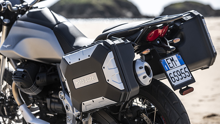 - Πακέτο Touring: παρμπρίζ touring, βαλιτσάκι πίσω αλουμινίου 48lt, θερμαινόμενα γκριπ, πλατφόρμα πολυμέσων Moto Guzzi MIA με κιτ εγκατάστασης