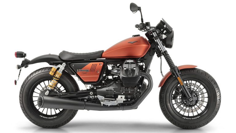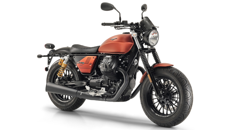 Ο χαρακτηριστικός ήχος του εγκάρσιου ελαιόψυκτου V-2 των 850cc και 55Hp ενισχύεται από τα βαμμένα μαύρο ματ και με βάση αλουμινίου slip-on τελικά της εξάτμισης, που διαθέτουν “φάλτσο” κόψιμο στο τελείωμά τους και που είναι εγκεκριμένα για χρήση στο δρόμο. Η ειδικά αφιερωμένη χρωματική επιλογή, ένα ολοκαίνουργιο και τολμηρό πορτοκαλί χρώμα, καλύπτει το ρεζερβουάρ καυσίμου με ένα ιδιαίτερο στιλπνό φινίρισμα και επεκτείνεται και στα πλαϊνά καπάκια αλουμινίου, διεισδύοντας με αυτόν τον τρόπο στη χαρακτηριστική total black mat εμφάνιση του V9 Bobber. Σκοτεινές πινελιές σκορπίζονται και σε άλλα μέρη, όπως στις ψύκτρες των κυλινδροκεφαλών, στην κατασκευασμένη από billet αλουμίνιο τάπα ρεζερβουάρ, στο πλαίσιο του προβολέα και στα γραφικά του πίνακα οργάνων. Άλλες ειδικές λεπτομέρειες προσδίδουν στη μπροστινή όψη της μοτοσυκλέτας μία ακόμα πιο επιθετική και μυώδη εμφάνιση. Το μπροστινό φτερό είναι πιο κοντό, το πιρούνι προστατεύεται από κλασικές φισούνες, ενώ ο χαμηλωμένος προβολέας πλαισιώνεται από ένα μίνι φέρινγκ αλουμινίου σε μαύρη απόχρωση.