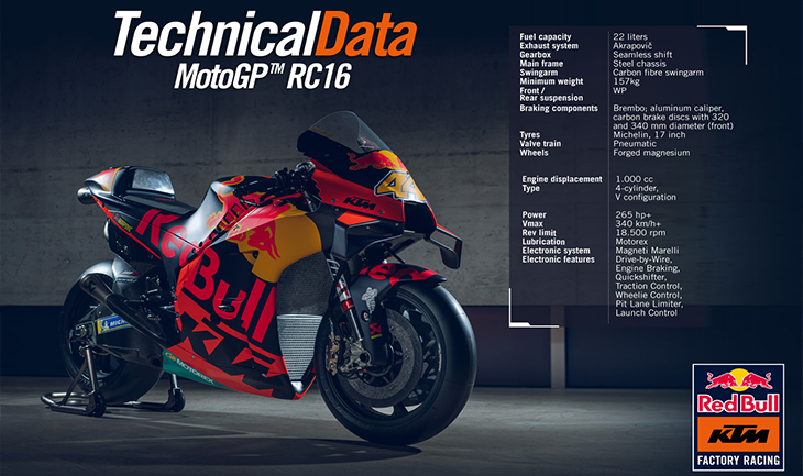 Oι προδιαγραφές της RC16, όπως μπορείτε να δείτε και στη συνημμένη φωτογραφία, φαντάζουν εντυπωσιακές, με την ΚΤΜ να ανακοινώνει ιπποδύναμη στους 265+ ίππους, τελική που ξεπερνά τα 340Km/h και βάρος στα ..157 κιλά.