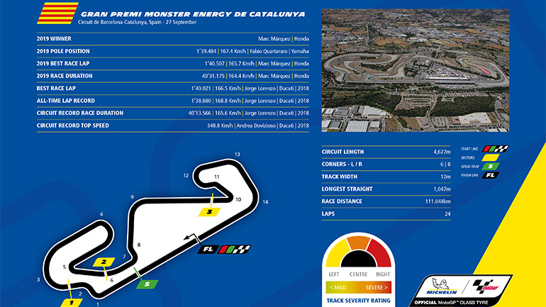 Αρχικά, ο αγώνας στην πίστα Circuit de Barcelona-Catalunya των 4.627 μέτρων, είχε προγραμματιστεί για τον Ιούνιο, αλλά λόγω της πανδημίας θα πραγματοποιηθεί στο τέλος του Σεπτεμβρίου. Η σχεδίαση της πίστας άλλαξε και νέα άσφαλτος τοποθετήθηκε το 2018. Η συγκεκριμένη πίστα χαρακτηρίζεται για τις γρήγορες και παρατεταμένες στροφές, τη μεγάλη ευθεία που ξεπερνάει το μήκος του ενός χιλιομέτρου καθώς και τις υψομετρικές εναλλαγές. Αποτελεί μια από τις πιο δημοφιλείς πίστες στους αναβάτες και συχνά δίνει συναρπαστικούς αγώνες, με τους θεατές να δημιουργούν μια φανταστική ατμόσφαιρα, οι οποίοι δυστυχώς φέτος λόγω των μέτρων για την πανδημία, δεν θα βρίσκονται στις κερκίδες.