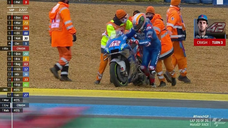 Θύμα της γλιστερής γαλλικής ασφάλτου δεν ήταν μόνο ο Valentino Rossi, καθώς την πρόσφυση των ελαστικών αποχαιρέτισαν μαζί με τον αγώνα τους και οι Franco Morbidelli, Cal Crutchlow, Tito Rabat και Bradley Smith. Ξεχωριστή αναφορά αξίζει ο «καμικάζι» Alex Rins, o οποίος παρά την 14η θέση εκκίνησης είχε φτάσει ως τη 2η θέση, η οποία στο τέλος του αγώνα έδωσε τη θέση της σε μια πτώση. Μια πτώση με παρελκόμενα, καθώς αν και ο Rins συνέχισε τον αγώνα, έπρεπε να τον διακόψει εξαιτίας ενός…ιμάντα που ξέμεινε στην κάμερα της ουράς της μοτοσυκλέτας του από τους ανθρώπους της πίστας που έσπευσαν σε βοήθεια. Επίσης, πολύ άτυχος και δικαιολογημένα μέσα στα νεύρα, ο Jack Miller επίσης δεν είδε την καρό σημαία, αφού ενώ πάλευε για μια θέση στο βάθρο προδόθηκε από τον κινητήρα της μοτοσυκλέτας του.