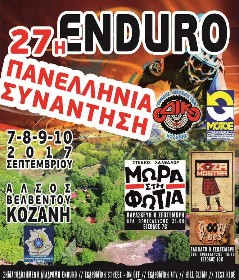 Ο Όμιλος Δικυκλιστών Κοζάνης διοργανώνει την 27η πανελλήνια συγκέντρωση Enduro, που θα πραγματοποιηθεί από τις 7 έως τις 10 Σεπτεμβρίου στο άλσος Βελβενδού. Οπότε, προετοιμαστείτε για χωμάτινα και ασφάλτινα εκδρομικά, διάσχιση μονοπατιών, light αλλά και hard διαδρομές. Απαραίτητη προϋπόθεση, να έχετε μοτοσυκλέτα Enduro, ΜΧ ή/και On-Off.