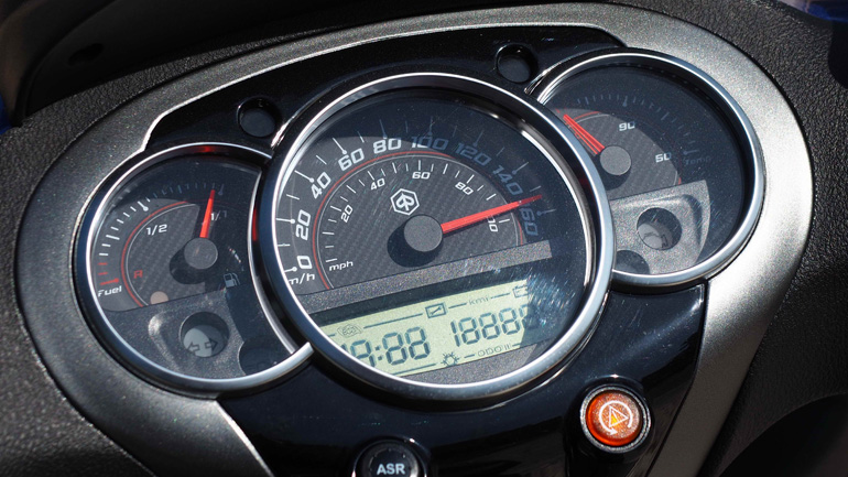 Στη δεξιά πλευρά του τιμονιού, δίπλα στο μπουτόν της μίζας, υπάρχει ένα αντίστοιχο που γράφει MODE και από αυτό ο αναβάτης μπορεί να διαχειριστεί τις ψηφιακές πληροφορίες του πίνακα. Δεν χρειάζεται, δηλαδή, να βγάλει το χέρι από το τιμόνι και αυτό εξυπηρετεί πολύ τη χρηστικότητα, αυξάνοντας σημαντικά και τη συνολική ασφάλεια.