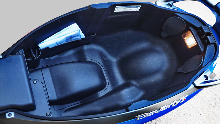 Οι χώροι για επιβάτη, συνεπιβάτη και αντικείμενα είναι άπλετοι. Η χωρητικότητα των 35,3 λίτρων κάτω από τη σέλα επιτρέπει τη φιλοξενία δύο κρανών τύπου «full jet»! Ιδανική λύση για όσους απεχθάνονται τη χρήση των ογκωδών και αντι-αεροδυναμικών top case βαλιτσών (πέραν του εξτρά κόστους που επιβάλλει η after market αγορά)! Εξαιρετικά χρήσιμη αποδείχθηκε και η… τριπλή επιλογή για το άνοιγμα της σέλας. Και λέμε τριπλή, γιατί μπορεί να ανοίξει α) με μπουτόν στο τιμόνι, β) με το στάνταρ τηλεχειριστήριο και γ) με μηχανικό μοχλό που βρίσκεται μέσα στο ντουλαπάκι κάτω από το τιμόνι (για την περίπτωση που το όχημα έχει ξεμείνει από μπαταρία).