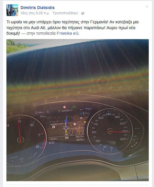 Με τόσα χλμ./ώρα στο κοντέρ «πιάστηκε» να οδηγεί ο δημοσιογράφος και παρουσιαστής των τηλεοπτικών μεταδόσεων των αγώνων του παγκοσμίου πρωταθλήματος ταχύτητας μοτοσικλετών MotoGP, Δημήτρης Διατσίδης. Πίσω από το τιμόνι ενός Audi A6 έδειξε να το απολαμβάνει, γι’ αυτό το λόγο ανέβασε και την σχετική φωτογραφία στον προσωπικό του λογαριασμό στο Facebook.