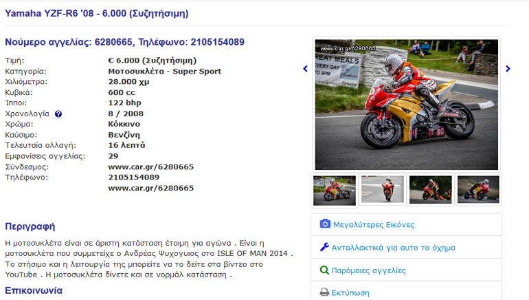 Σε αγγελία πώλησης μεταχειρισμένων οχημάτων βρίσκεται προς διάθεση, η συλλεκτική πλέον Yamaha R6 με την οποία συμμετείχε στο Isle of Man 2014 ο Ανδρέας Ψυχογυιός.