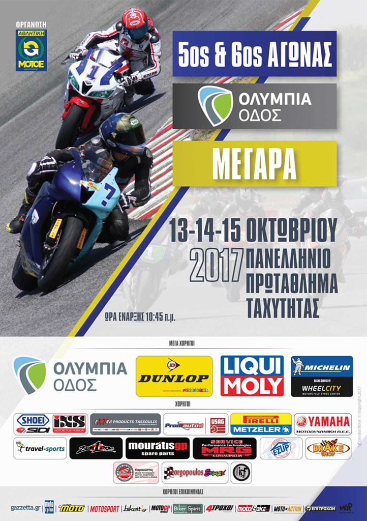 Η πίστα των Μεγάρων είναι αυτή που θα φιλοξενήσει τον 5ο & 6ο Αγώνα του Πανελλήνιου Πρωταθλήματος Ταχύτητας 2017. Οι δύο αγώνες με τους οποίους και ολοκληρώνεται το εφετινό Πρωτάθλημα θα γίνουν το Σάββατο και την Κυριακή 14 & 15 Οκτωβρίου, ενώ το πρόγραμμα θα ξεκινήσει την Παρασκευή με τις ελεύθερες & κατατακτήριες δοκιμές. Όπως πάντα, οι αγώνες των κατηγοριών Νέοι, Racing/Supersport 300, Supersport (SSP), Superbike (SBK) και Open αναμένεται να έχουν έντονο συναγωνισμό, αφού μέσα από αυτούς θα ανακηρυχθούν και οι πρωταθλητές.