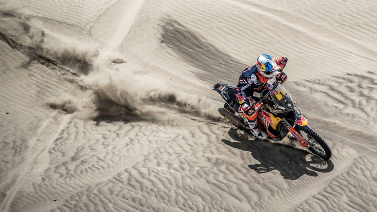 Στις 6 μέρες του αγώνα, η πρώτη θέση της γενικής κατάταξης έχει αλλάξει χέρια 4 φορές! Τη χθεσινή κουτσουρεμένη 6η ειδική την κέρδισε ο Γάλλος Antoine Méo (KTM, τετράκις παγκόσμιος πρωταθλητής Enduro), καταφέρνοντας να τερματίσει τα 194 χιλιόμετρα της διαδρομής λιγότερο από μισό λεπτό μπροστά από τον Αργεντινό Kevin Benavides (Honda, 4oς στο Dakar του 2016) και τον Άγγλο Toby Price (ΚΤΜ, νικητής του αγώνα το 2016). Κανονικά η διαδρομή, που πέρασε από το Περού στη Βολιβία, είχε μήκος 313 χιλιομέτρων, αλλά οι καιρικές συνθήκες οδήγησαν τους οργανωτές στη ματαίωση των πρώτων 119.