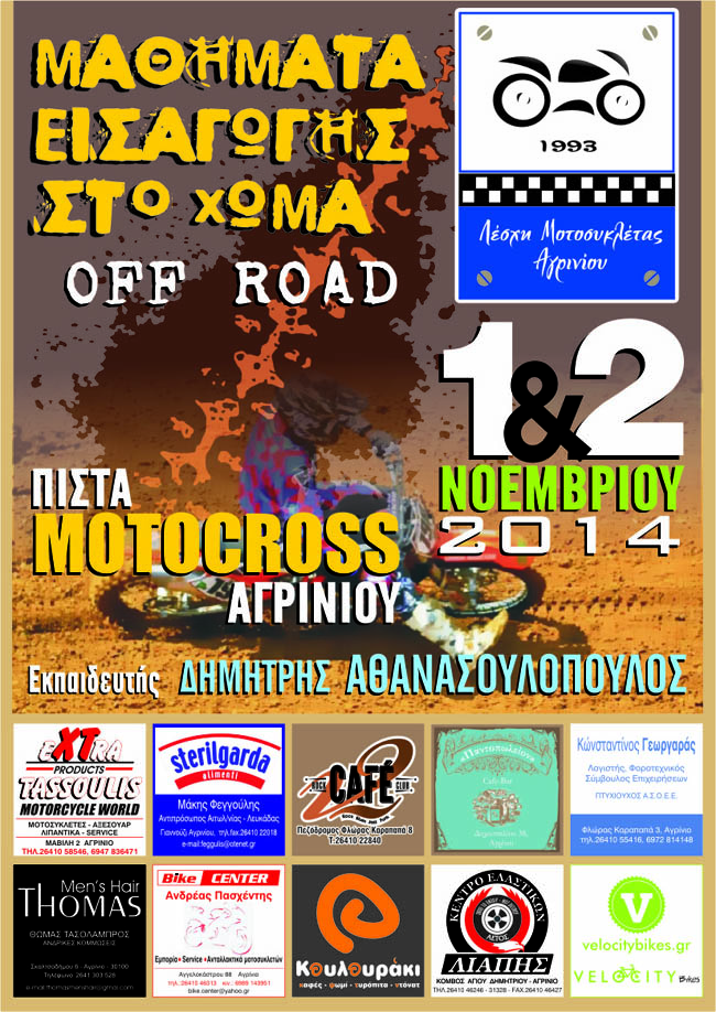 Η Λέσχη Μοτοσικλέτας Αγρινίου (Agrinio Moto Club) προσφέρει τη δυνατότητα σε όλους τους αναβάτες να παρακολουθήσουν μία πολύ ενδιαφέρουσα εκδήλωση που είναι προγραμματισμένη για το Σαββατοκύριακο 1-2 Νοεμβρίου. Πρόκειται για τα «μαθήματα εισαγωγής στο χώμα», που απευθύνονται σε όσους αγαπούν το motocross η απλά κινούνται σε διαδρομές εκτός δρόμου.