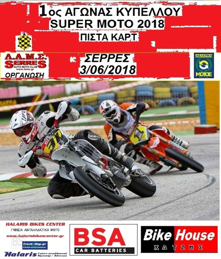 – «Η ΛΑΜΣ μετά από απόφαση που πήρε να στηρίξει το κύπελλο Supermoto και να βάλει το χέρι στην τσέπη της με τη διοργάνωση του 1ου αγώνα. Ο προγραμματισμένος αγώνας για τις 3/6/2018 στις Σέρρες διοργάνωση ΛΑΜΣ, τελικά δεν έγινε. Ακυρώθηκε λόγο μη συμμετοχής των αθλητών στη σχάρα εκκίνησης. Η διαδικασία του αγώνα ξεκίνησε με τον Τεχνικό έλεγχο στις 8.00π.μ. σύμφωνα με το πρόγραμμα του αγώνα. Όλες οι διαδικασίες του αγώνα προχώρησαν σύμφωνα με το πρόγραμμα, ένα πρόβλημα στη ζεύξη του χρονομέτρου με το πρόγραμμα χρονομέτρησης στα δεύτερα χρονομετρημένα δοκιμαστικά, με όλες τις προσπάθειες που έκανε η οργάνωση, έφερε μια χρονική καθυστέρηση έως την επίλυσή του μία ώρα και τριάντα λεπτά με αποτέλεσμα ότι αντί το πρώτο σκέλος του αγώνα να ξεκινήσει στις 1.30μ.μ. να μπορεί να ξεκινήσει 3.00μ.μ. Παρά τις εκκλήσεις των διοργανωτών, οι αθλητές ζήτησαν την οριστική διακοπή του αγώνα προφασιζόμενοι το πέρας της ώρας. Η ΛΑΜΣ ζητά συγγνώμη για το τεχνικό πρόβλημα που προέκυψε κατά τη διεξαγωγή του αγώνα»