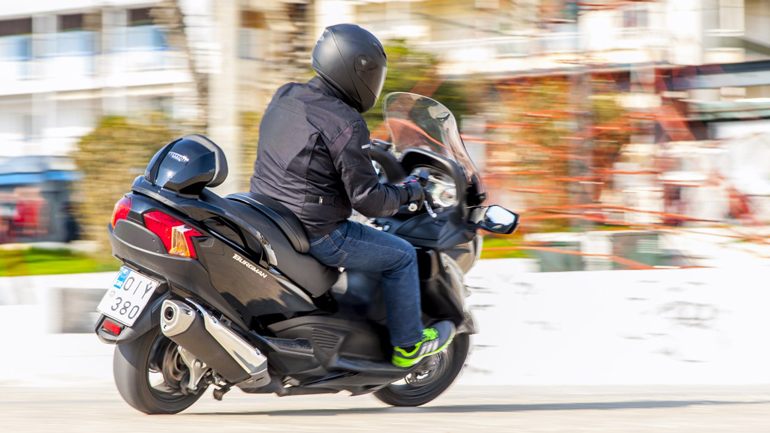 Το ABS λειτουργεί σωστά σε γενικές γραμμές και διαθέτει πολύ καλή αίσθηση στο μπροστινό τροχό. Πίσω ενεργοποιείται πιο εύκολα. Θα το νιώσετε, γιατί πολύ απλά η μανέτα ελαφραίνει ακαριαία, ειδικά σε ανωμαλίες του οδοστρώματος. Έξω από την πόλη το επίπεδο εξοπλισμού και ο ηλεκτρικός σε λειτουργία κινητήρας δείχνουν τις αρετές τους. Μπορείς να ταξιδεύεις επί ώρες με ταχύτητες κοντά στα 150Km/h. και να μη νιώθεις ίχνος κούρασης. To Burgman ανεβάζει χιλιόμετρα γρήγορα και η σταθερότητα που προσφέρει στα “πολλά” είναι λίαν αποδεκτή, όπως και η αεροδυναμική προστασία του αναβάτη. Αλλά ακόμα κι αν «μπλέξετε» με στροφές, θα ανταποκριθεί με επιτυχία, καθώς πλαίσιο και ανάρτηση συνεργάζονται έτσι όπως πρέπει για να προσφέρουν στιβαρότητα, πάντα στα όρια της οδήγησης ενός scooter βέβαια. Κάτι ακόμα ευχάριστο έχει να κάνει με την κατανάλωσή του, που κρίνεται λογική στα 5,5 λίτρα ανά 100 χιλιόμετρα.