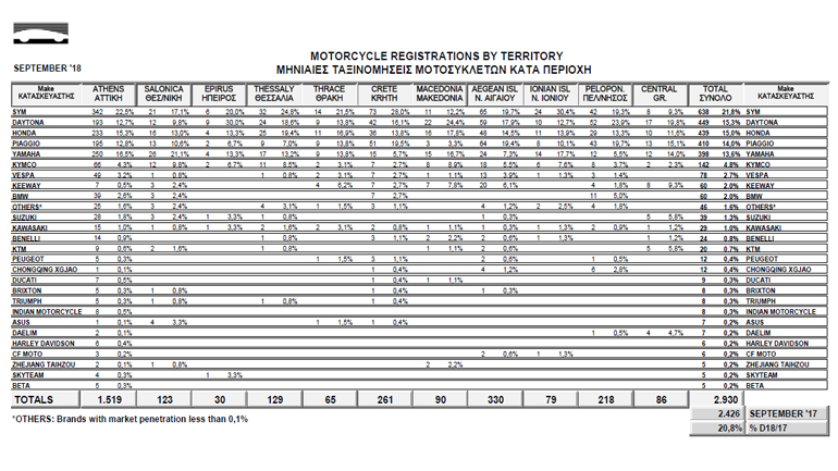 Τα πάνω κάτω, ή μάλλον τα κάτω πάνω, ήρθαν στην εγχώρια αγορά μοτοσυκλέτας το μήνα Σεπτέμβριο, όπου για πρώτη φορά στα χρονικά SYM και Daytona φιγουράρουν μαζί στις πρώτες θέσεις. Το φθινόπωρο μπήκε δυναμικά για την αγορά μοτοσυκλετών, scooter και ATV άνω των 50cc, με τις πωλήσεις να παρουσιάζουν το Σεπτέμβριο αύξηση κατά σχεδόν 21% σε σχέση με τον αντίστοιχο μήνα του 2017. Αυτό μεταφράζεται σε 2.930 ταξινομήσεις, δηλαδή 500 περισσότερες από πέρυσι, που στέλνουν το δικό τους ηχηρό μήνυμα για ένα 2019 ακόμα πιο δυνατό. Στην πρώτη θέση βρέθηκε η SYM με 638 μονάδες, στη δεύτερη η καλπάζουσα Daytona με 449, στην τρίτη η Honda με 10 λιγότερες (439), στην τέταρτη η Piaggio με 410, στην πέμπτη η Yamaha με 398 και στην έκτη η Kymco με 142.