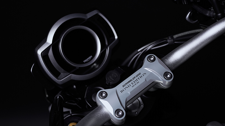Για να γιορτάσει αυτή την εμβληματική συνεργασία, η βρετανική φίρμα παρουσιάζει την πρώτη επίσημη μοτοσικλέτα που συνδέεται απευθείας με το Bond Franchise. Το Scrambler 1200 Bond Edition είναι μια εξαιρετικά σπάνια, περιορισμένης παραγωγής μοτοσικλέτα, που διαθέτει μοναδικό σχεδιασμό 007 και προορίζεται για αριθμημένη παραγωγή μόλις 250 κομματιών παγκοσμίως. Η Bond Edition εμπνεύστηκε από τις ανάγκες της ταινίας και βασίζεται στο μοντέλο παραγωγής Scrambler 1200 XE .