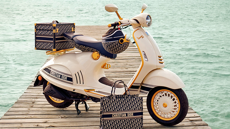 Η σύγχρονη έκδοση της εμβληματικής Vespa 946, που παρουσιάστηκε το 2012 στο Μιλάνο και διακρίθηκε για τις κομψές και μίνιμαλ γραμμές καθώς και για τις τεχνολογικές της καινοτομίες, επανασχεδιάστηκε για την περίσταση από τη σινιόρα Maria Grazia Chiuri, διευθύντρια δημιουργικού των γυναικείων συλλογών της Dior. Το scooter θα κατασκευάζεται στην Ιταλία, με τη φροντίδα, την αφοσίωση και την ακρίβεια ενός οίκου μόδας. Το βαλιτσάκι αποτελεί σχέδιο του Marc Bohan από το 1967 και είναι ειδικά κατασκευασμένο ώστε να στερεώνεται στη σχάρα αποσκευών. Η αποκλειστική σειρά αξεσουάρ συμπληρώνεται από ένα κράνος διακοσμημένο με το ίδιο εμβληματικό μοτίβο.