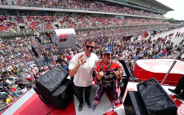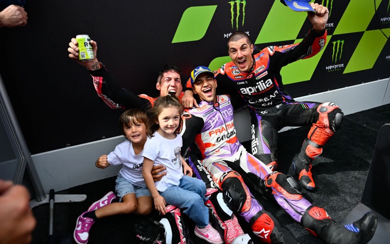 Ο Νικητής Aleix Espargaro με τα δίδυμα παιδιά του Max και Mia και τους Vinales, Martin να πανηγυρίζουν μαζί τους