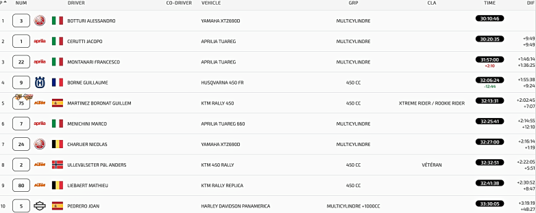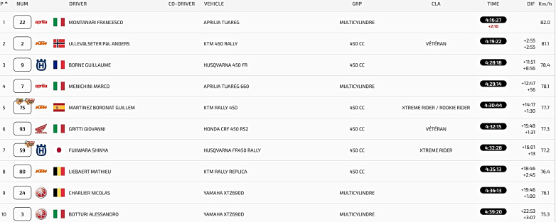 Ο Marco Menichini εντυπωσίασε επίσης, καταλαμβάνοντας την 4η θέση, 14 λεπτά και 57 δευτερόλεπτα πίσω από τον επικεφαλής, και διατηρώντας την 6η θέση στη γενική κατάταξη. Με όλες τις μοτοσυκλέτες Tuareg Rally 660 στην πρώτη εξάδα, η Aprilia Tuareg Racing επιβεβαιώνει την κυριαρχία της στις κατασκευάστριες ομάδες.