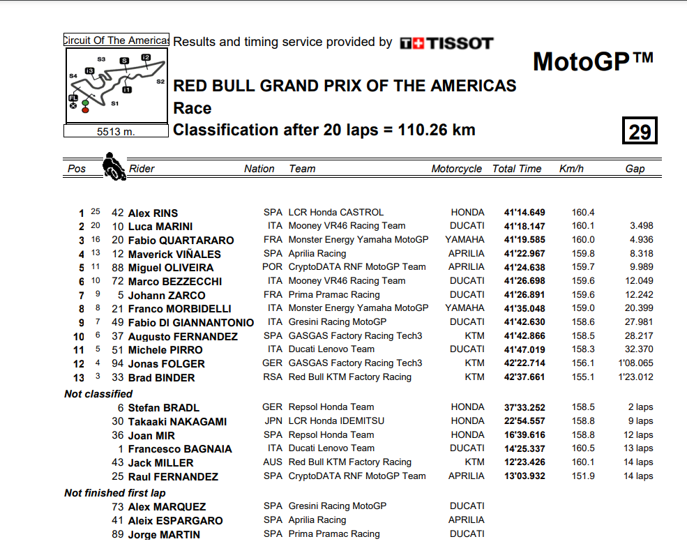 Ο Marini πήρε το παρθενικό του βάθρο με τη δεύτερη θέση, ενώ μετά την απογοήτευση του Sprint, ο Quartararo ανέβηκε στο βάθρο, παίρνοντας την 3η θέση.