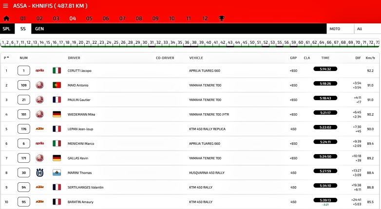 Ο Jacopo Cerutti, οδηγώντας την Aprilia Tuareg Rally, κατέκτησε την πρώτη του νίκη σε Ειδική Διαδρομή για την έκδοση του 2026 και ανέλαβε την πρωτοπορία στη γενική κατάταξη. Ο πρωταθλητής εν ενεργεία προηγείται πλέον στη γενική κατάταξη με διαφορά +4’49’’ από τον πλησιέστερο αντίπαλό του και βρίσκεται επίσης στην 1η θέση της κατηγορίας δικύλινδρων μοτοσυκλετών στα +650 κ.εκ.