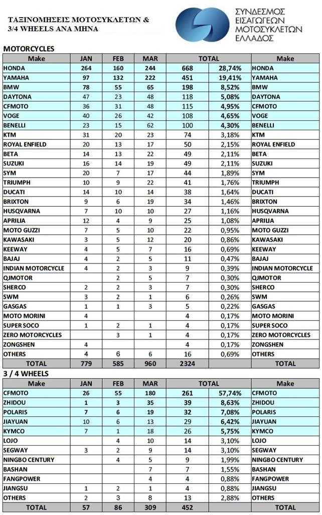 Μετά από έναν απίστευτο Ιανουάριο όπου είδαμε τις ταξινομήσεις να φτάνουν τα 3.864 δίκυκλα (1.772 περισσότερα από το ίδιο διάστημα του 2022) ο Φεβρουάριος ήταν σχετικά συγκρατημένος και οι ταξινομήσεις παρουσίασαν πτώση 10%, άλλα ήρθε ένας πολύ καλός Μάρτιος, με αύξηση που ξεπέρασε το 48%, και κάλυψε άνετα τη διαφορά οδηγώντας το τρίμηνο σε νέο ρεκόρ πωλήσεων – ταξινομήσεων με 12,250 ταξινομήσεις νέων δικύκλων.